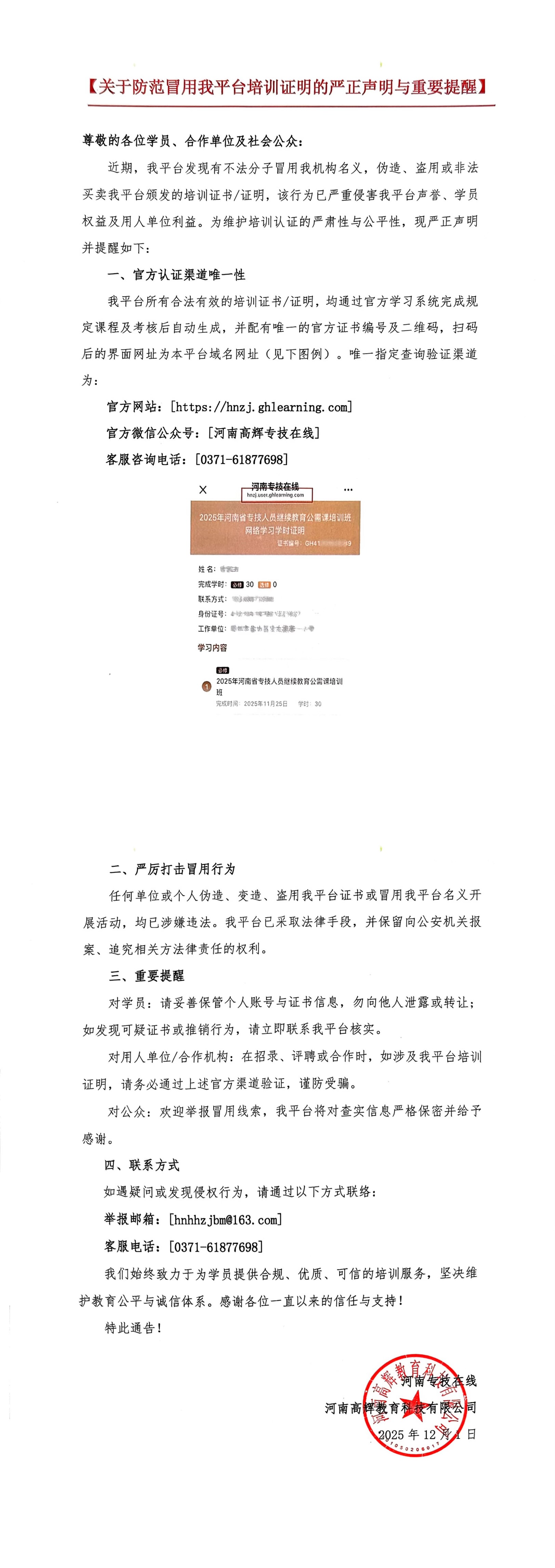 【严正声明】关于防范冒用我平台培训证明的严正声明与重要提醒 2025-12-01