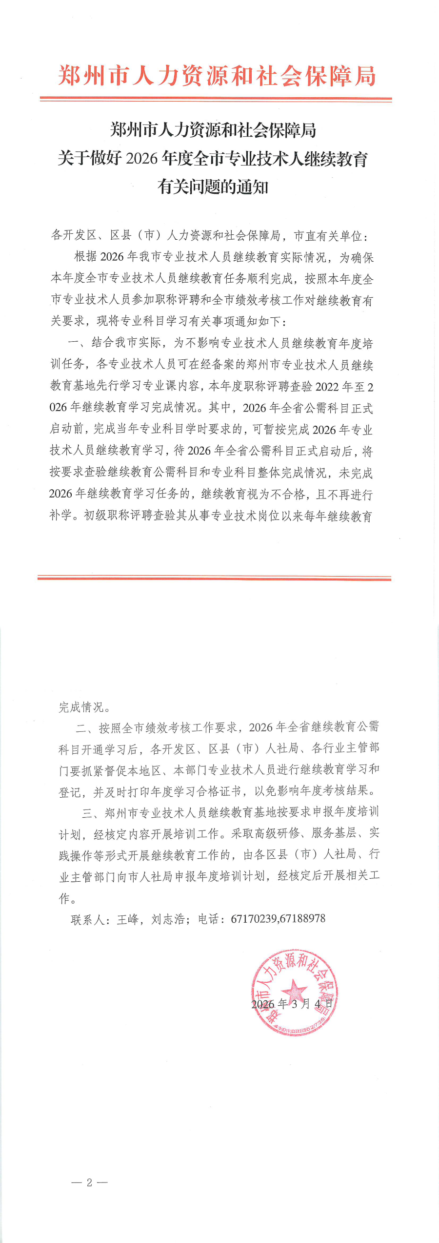 郑州市人力资源和社会保障局关于做好2026年度全市专业技术人员继续教育有关问题的通知